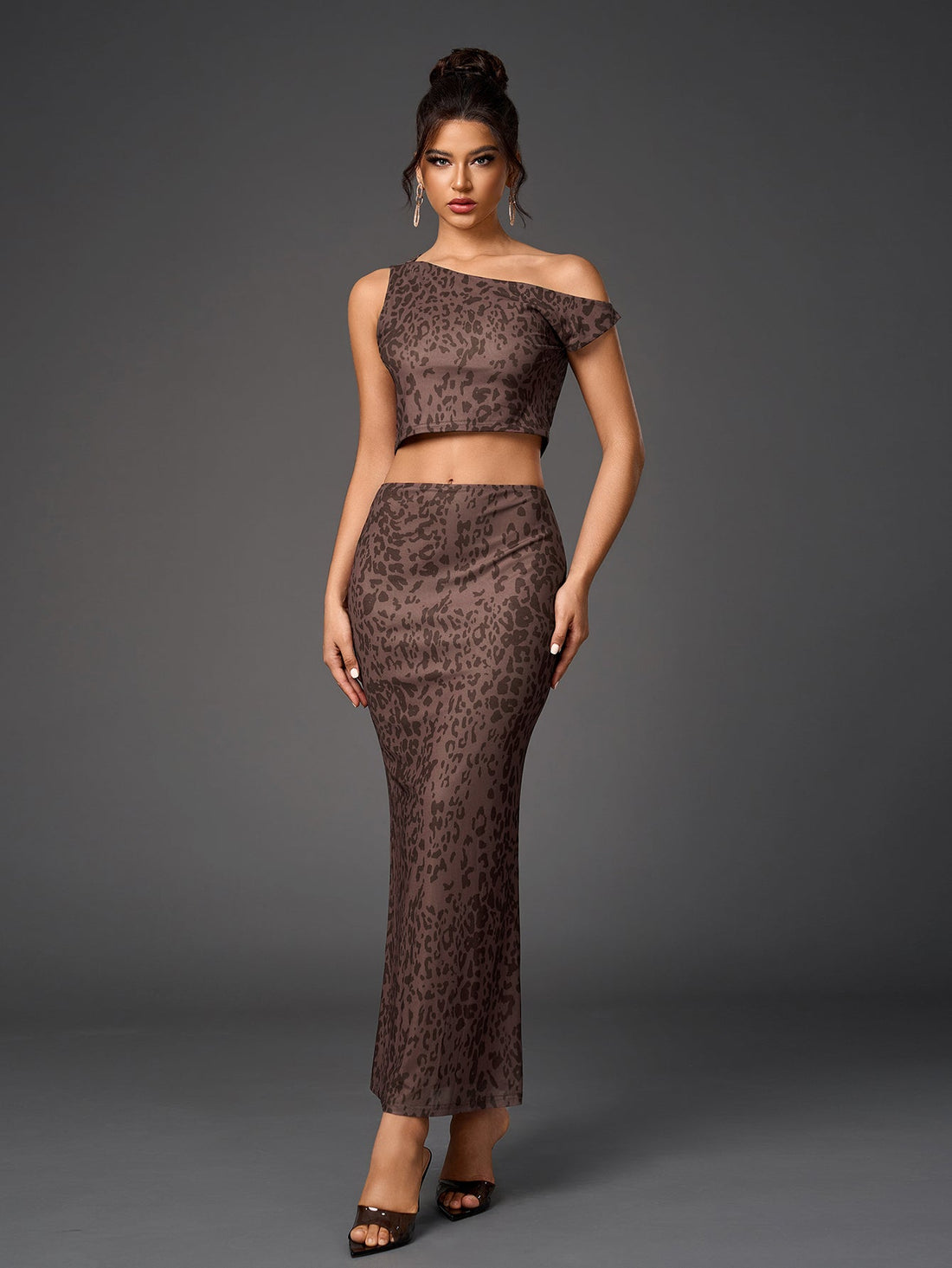 One Shoulder Draped Tie Backless Top&Mesh Print Bodycon Skirt