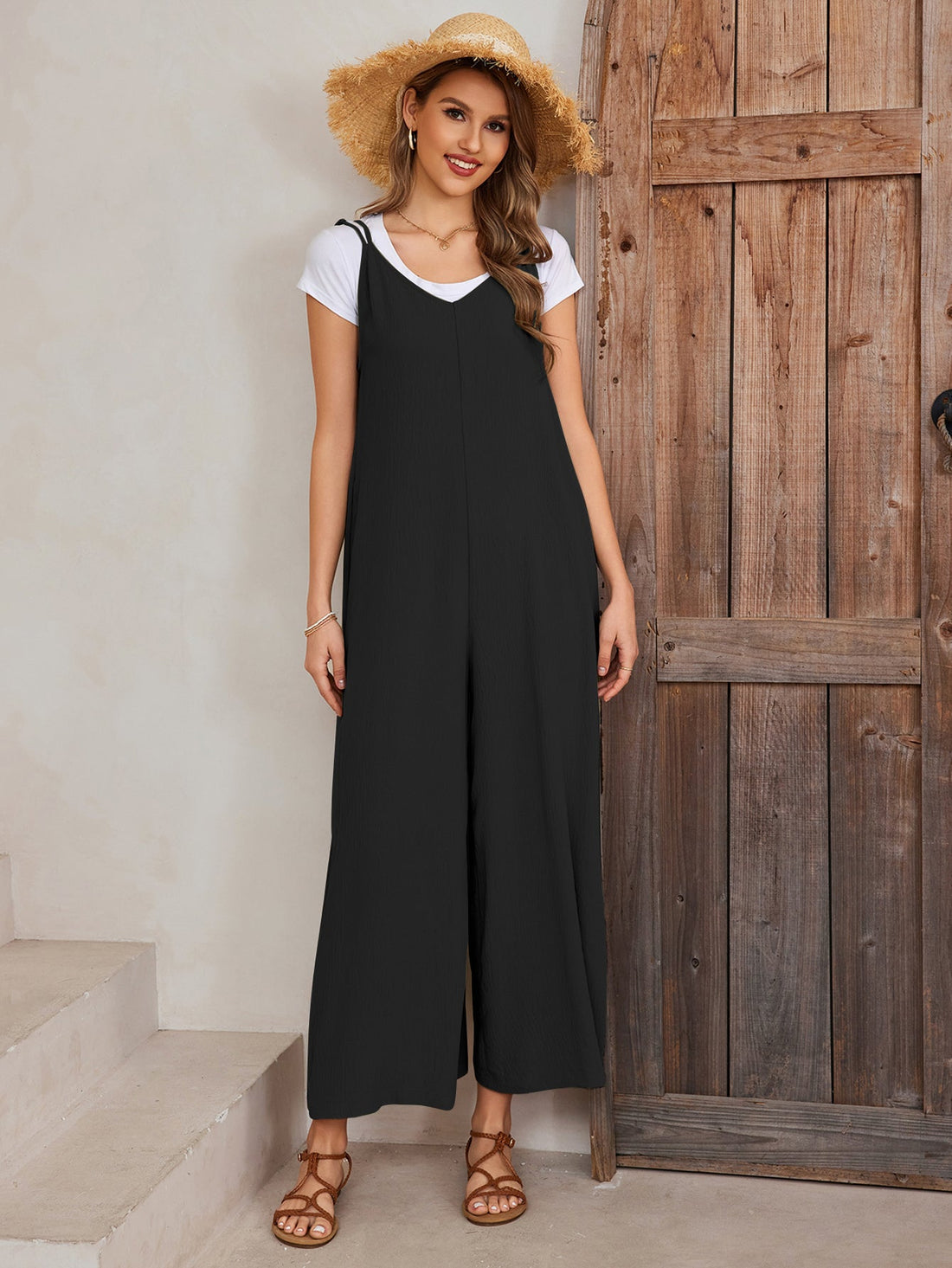 Deep V-Neck Crisscross Back Pocket Jumpsuit