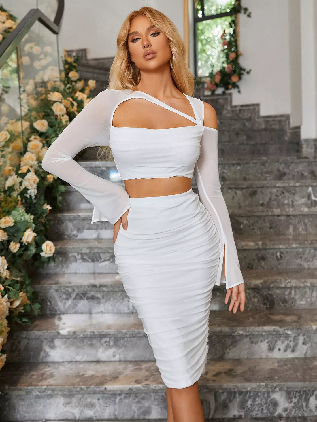 Sheer Long Sleeve Top Ruched Skirt Set