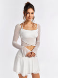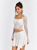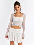 Flounce Sleeve Halter Mesh Crop Top&Flared Hem Skirt